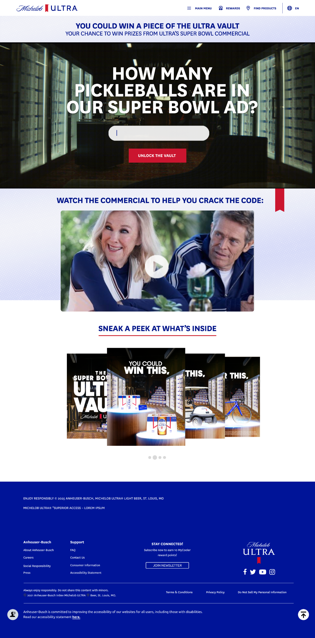 To extend Michelob ULTRA’s 2025 Super Bowl spot, The Ultra Hustle, we created The Ultra Vault, a high-stakes sweepstakes housed within Superior Access. Viewers had to actively watch the commercial and solve a challenge tied to the ad to enter, while members received early access. Prizes included a year’s supply of Michelob ULTRA, a branded golf cart, World Cup tickets, and premium sports experiences, turning a single media moment into sustained participation.